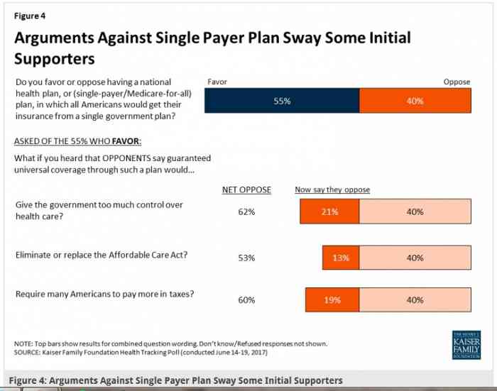 “While 55 percent of Americans say they want a single-payer/Medicaid-for-all plan, those in favor tend to change their minds when they hear that it means giving the government more control over health care, or that Americans would have to pay more in taxes.