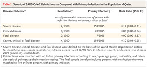 Another recent study published in the New England Journal of Medicine based on the Qatar national database of all SARS-CoV-2 primary infections from February 28, 2020 to April 28, 2021 looked at the risk of severe, critical and fatal COVID disease caused by reinfection. The rate of reinfection during the study period was only 0.5% (1,304 out of 265,779). Maybe more importantly, the odds ratio of severe re-infection compared to primary infection was 0.12 and there were ZERO critical re-infections and ZERO deaths in the other 1,300 cases.
